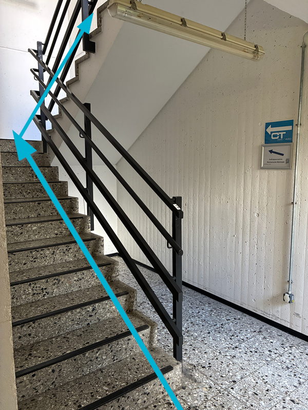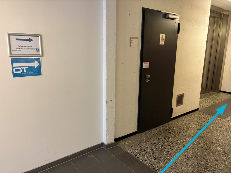 Durch die Eingangstür von ICN gehen, dann den blauen CT das radio-Schildern folgen.