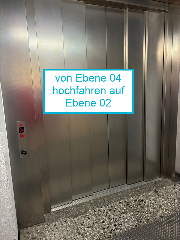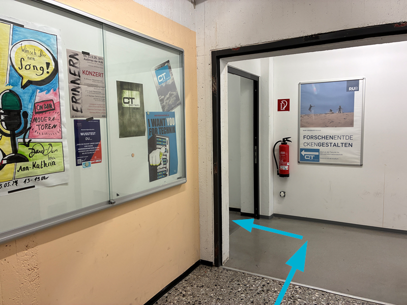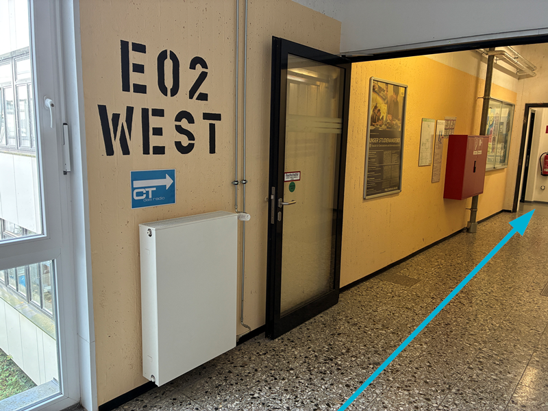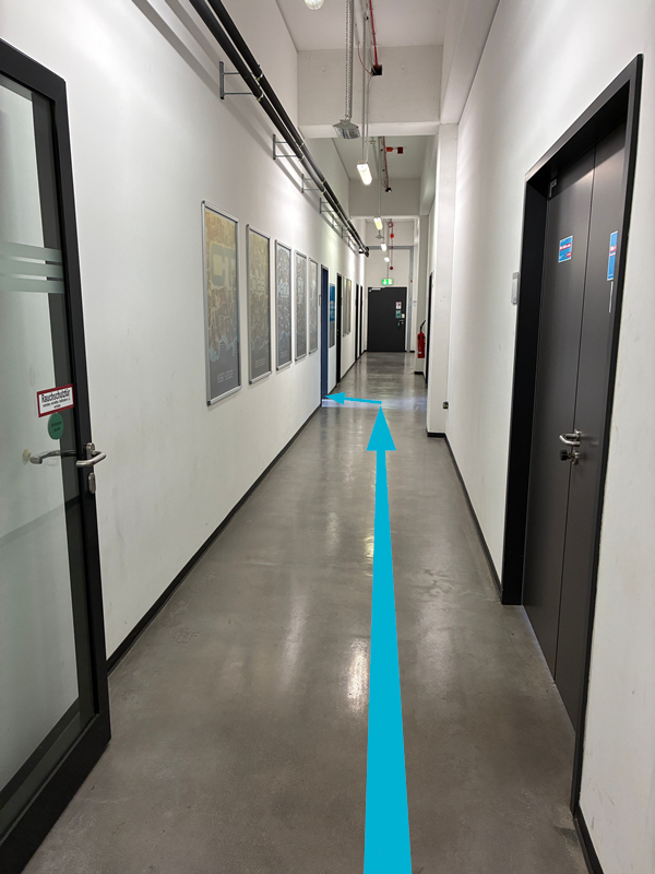 Durch die erste Glastür nach links in den langen Gang gehen.